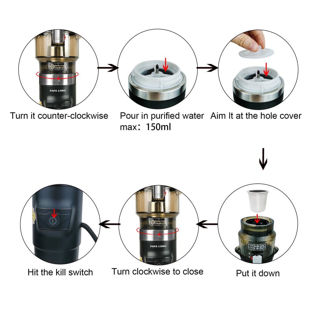 This isn't a weak drip brewer. It uses the proven Moka Pot pressure method to force hot water through coffee grounds, extracting a concentrated, full-bodied, and aromatic brew that rivals expensive coffee shops. The process is simple: add water, insert your pod, tighten the seal, plug into your 12V outlet, and press brew. In just minutes, you'll hear the "DI DI DI" signal that your perfect drink is ready.