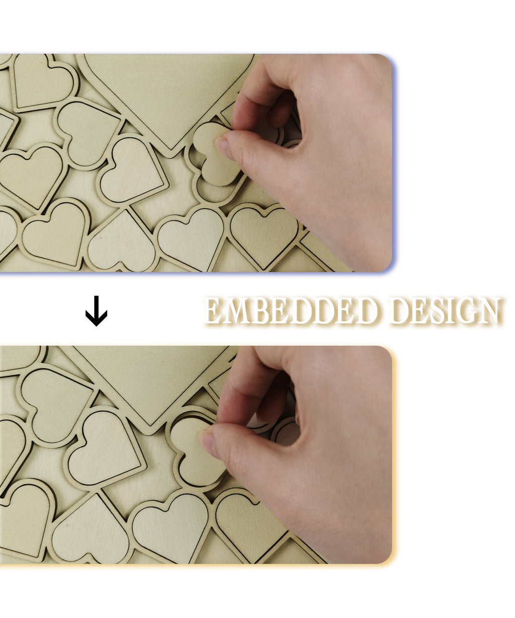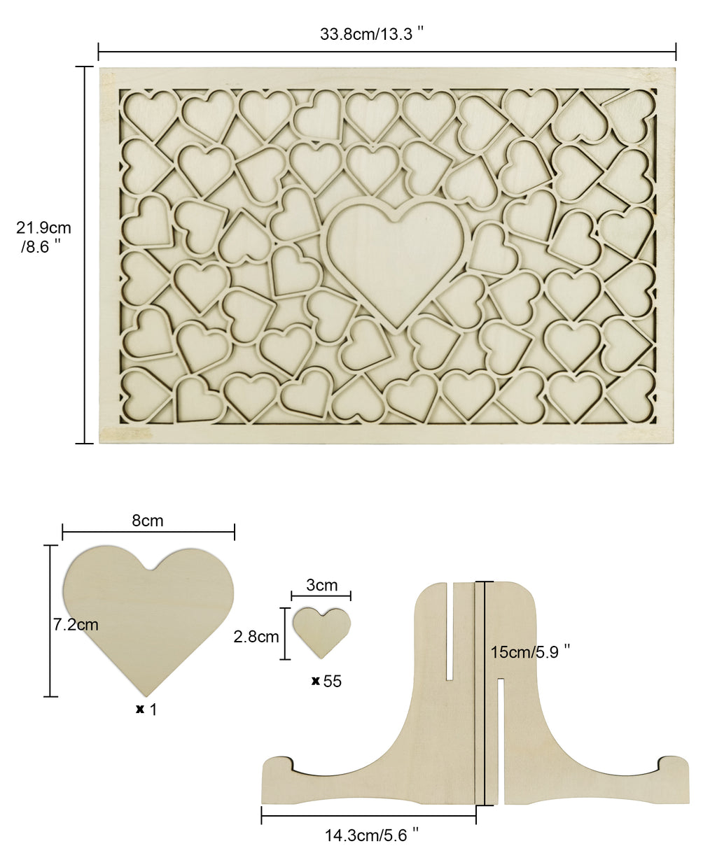 • 5:) Detailed List for Package– 13.3" X 8.6" wood frame , Wooden stand,5.6 inchX 5.9 inch ; 54 pieces Wooden hearts 3cm x 2.8 cm +2 wooden big hearts 8cm* 7.2cm, 1 big heart is a free replacement
